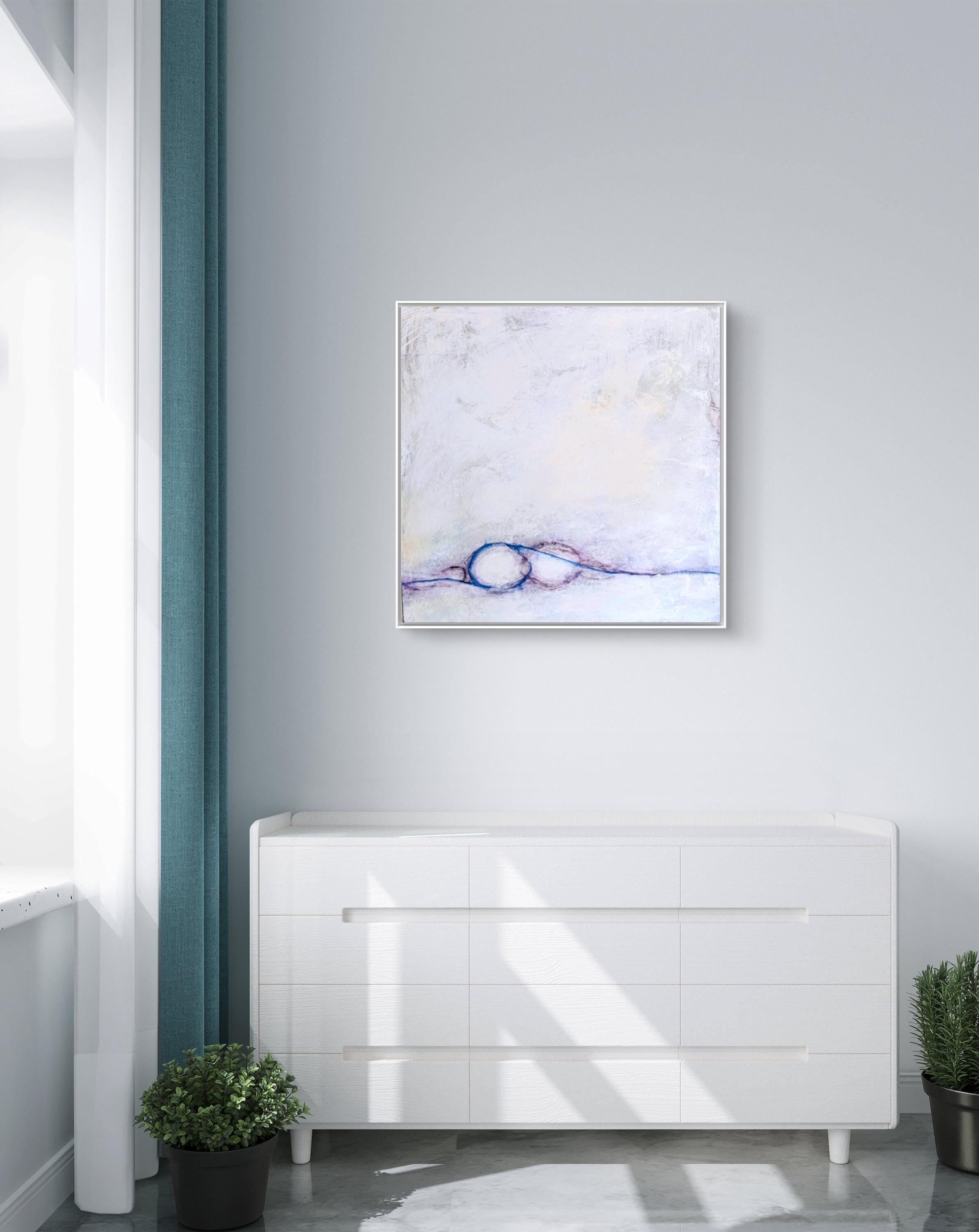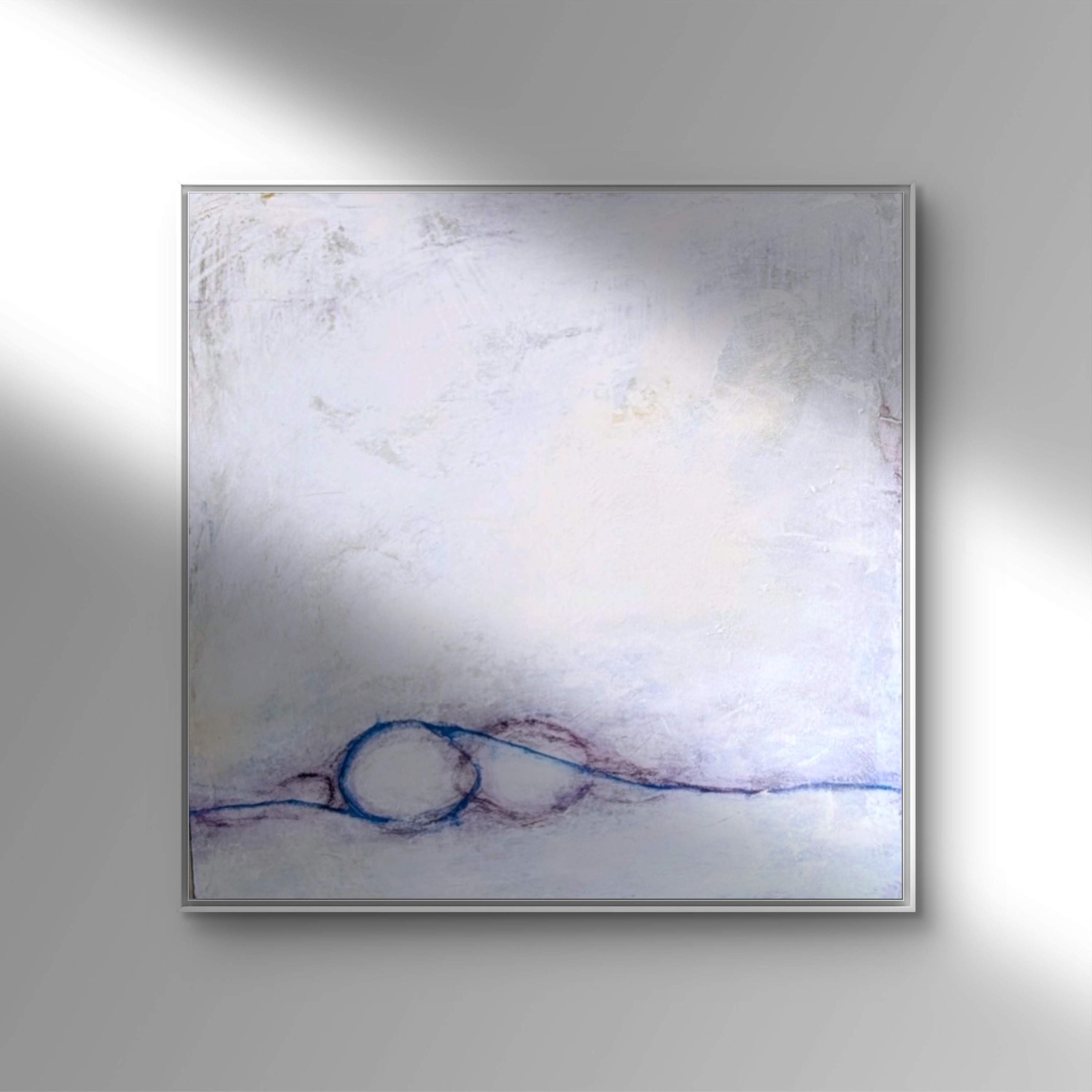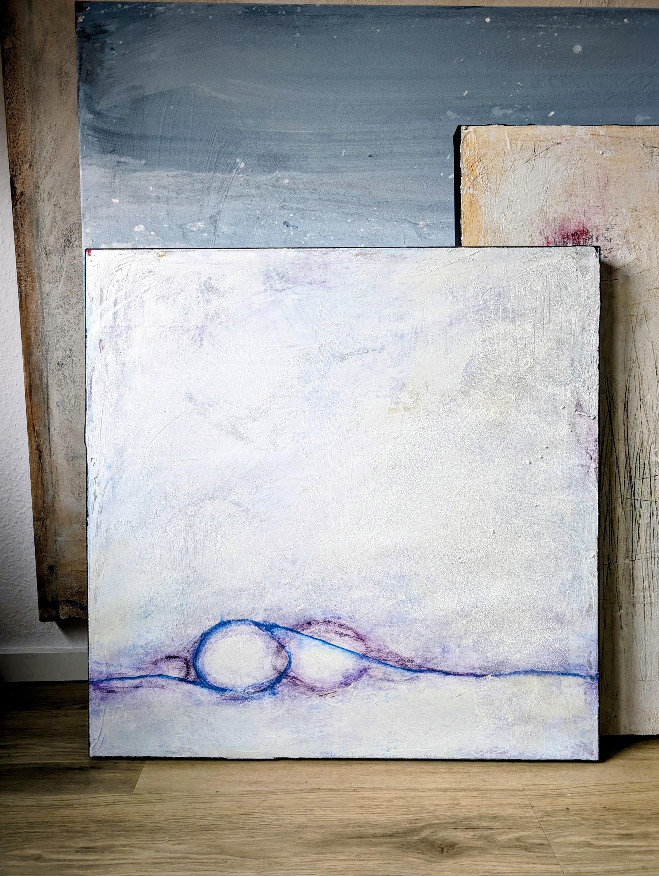 This abstract work in white and soft lilac tones appears both calm and vibrant. The light surfaces open up the space, while subtle layers of color and textures create a gentle depth.